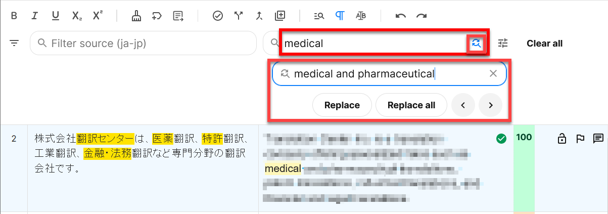 ※ 訳文欄の用語を一括検索・置換したい場合は、エディター上部の訳文検索ボックスに検索する文字列を入力して検索してください。置換したい場合は訳文検索ボックスの右のマークをクリックして展開し、置換後の文字列を入力して処理します。
