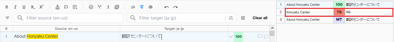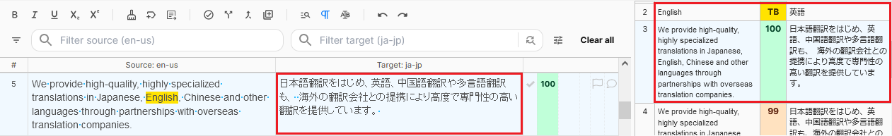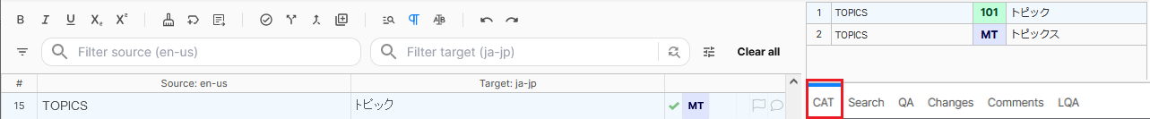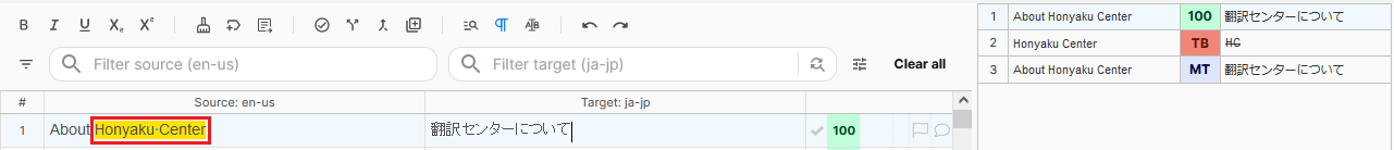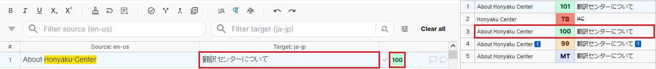 訳文欄の訳と、CAT欄に表示されている100%一致以下のTMを見比べ、訳文が適切か確認してください。