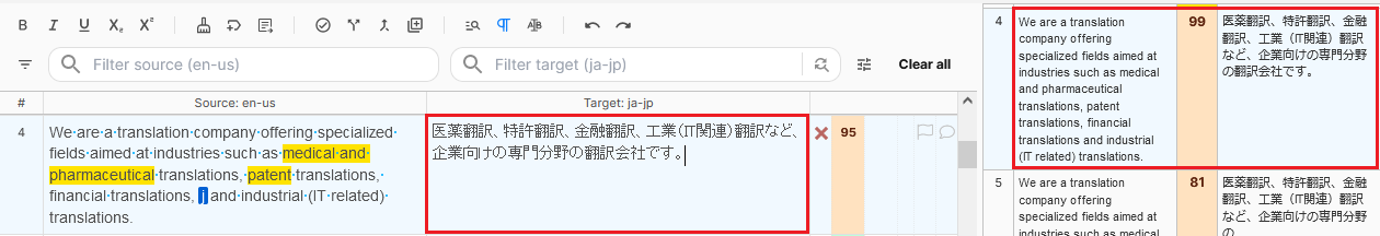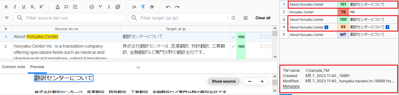 3) CAT欄に表示されているTMの一致率が高い場合は、翻訳は基本的にTMを流用して行われています。