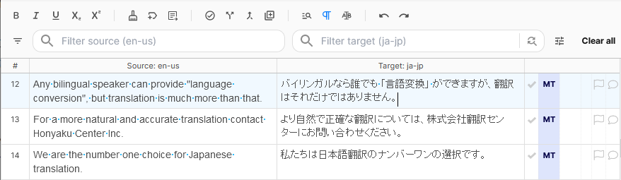 翻訳がMT訳を利用して行われている場合、MT訳に特徴的な誤りを見落として訳文を登録してしまっている可能性があります。