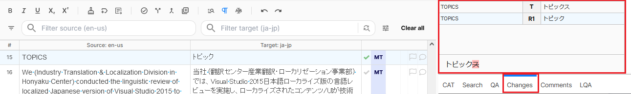 画面右下の[Changes]タブをクリックしてから訳文欄をクリックすると、CAT欄がChanges欄に切り替わり、校正開始前(翻訳完了時)と校正後の訳文、その比較結果が表示されます。