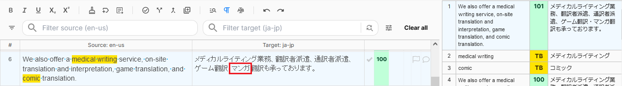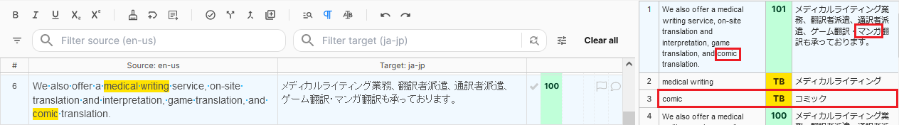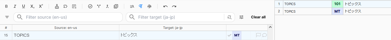 TMについては、訳文欄の訳が100%一致のTMと一致しているか、また訳文が適切かを確認します。