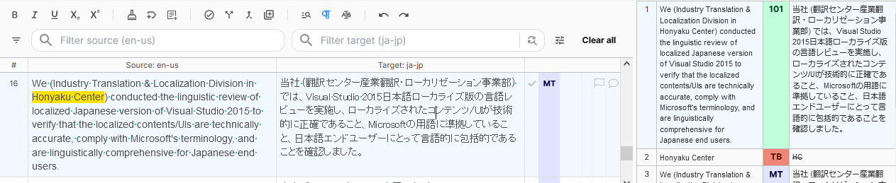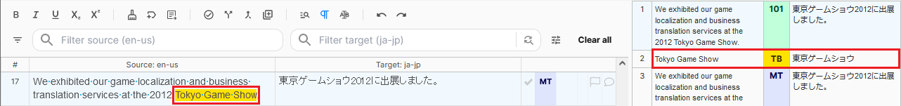 3) セグメント17をクリックしなおすと、登録した用語が原文欄で黄色でハイライトされ、CAT欄にも表示されます。