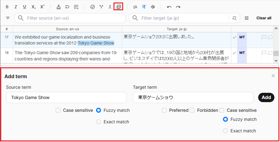 TBについては、訳文欄の訳に指定用語が使われているか、また禁止用語が使われていないかを確認します。