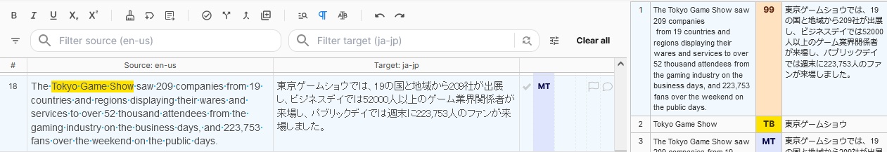 今回のファイルではセグメント12~19は参考になるTM・TBがないため、CAT欄にはMT訳と翻訳時に登録された101%一致TMのみ表示されます。
