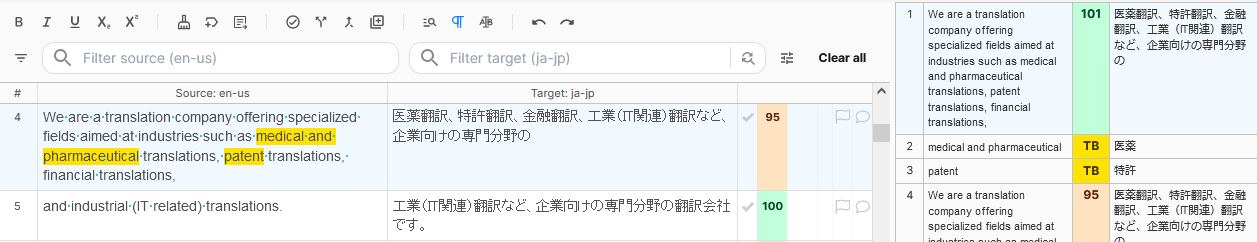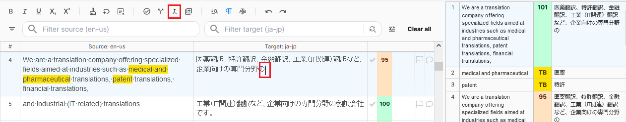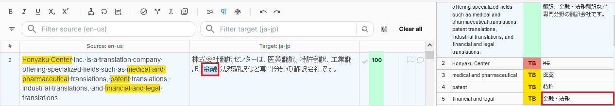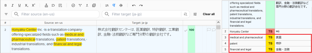 ハイライトはプロジェクトに設定してあるTBにその用語が登録されていることを示します。