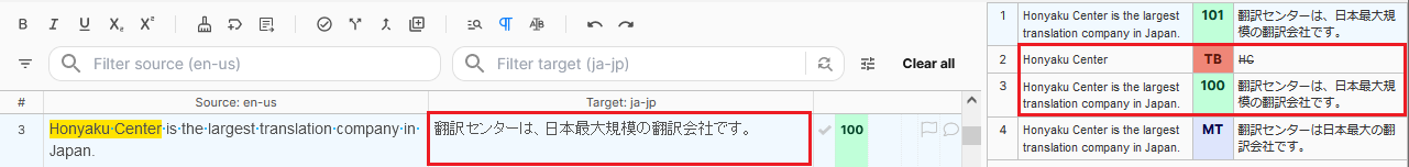 2) 右のCAT欄には「Honyaku Center」が赤色TBで表示され、訳語には取り消し線が付いています。赤色TBは禁止用語を意味します。