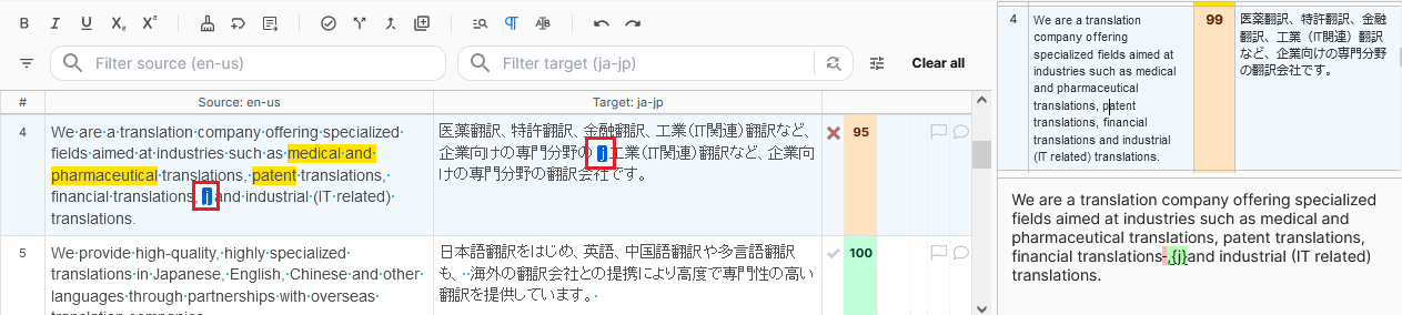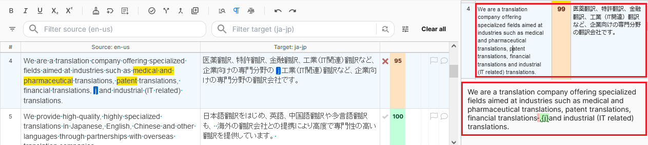 1) 翻訳時に99%一致のTMが利用されていますが、その後編集された可能性もありますので、訳文とCAT欄の情報を比較確認します。