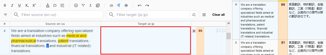 4) 訳文をTMの訳と差し替えるため、訳文欄の訳を消去します。