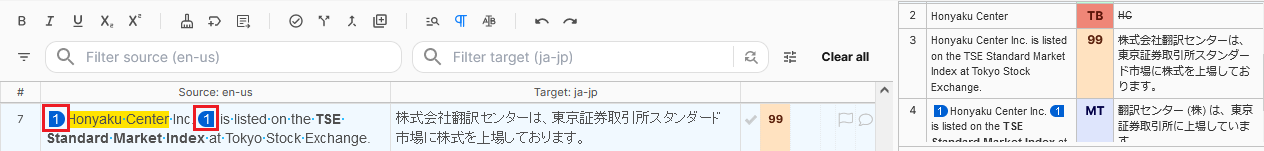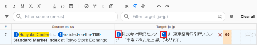 原文と対応する訳文の位置にもタグを設定し、原文の情報を反映させてください。ペアタグの場合はタグに同じ数字が表示されていますが、向きを間違えないように設定してください。