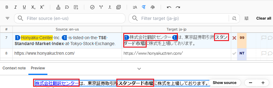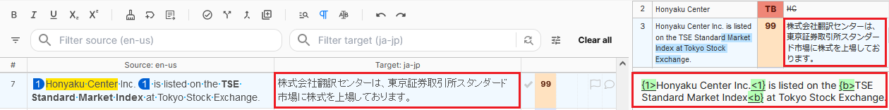 今回はタグが原文の「Honyaku Center Inc.」の前後にありますので、該当する訳文「株式会社翻訳センター」の前後にそれぞれ同じタグを設定します。