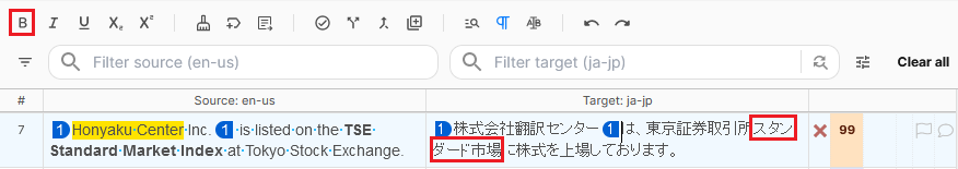 今回は原文の「TSE Standard Market Index」が太字ですので、訳文でも「スタンダード市場」を太字に設定します。書式を反映させたい部分を範囲選択し、 Ctrl+Bまたは エディター上部の[B]をクリックします。