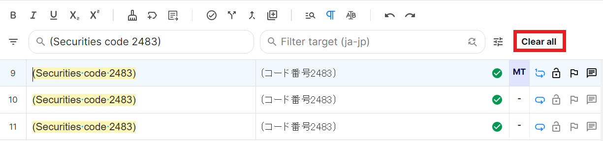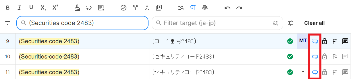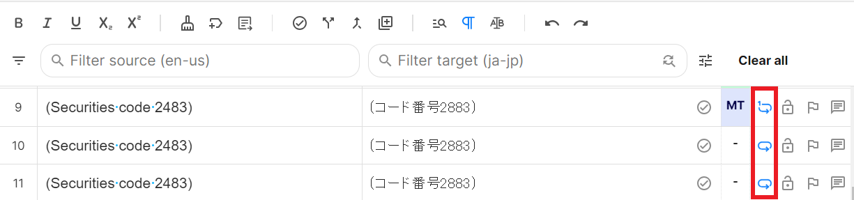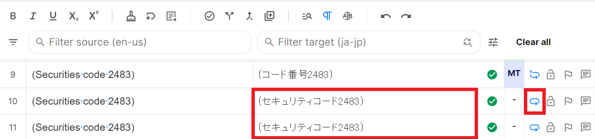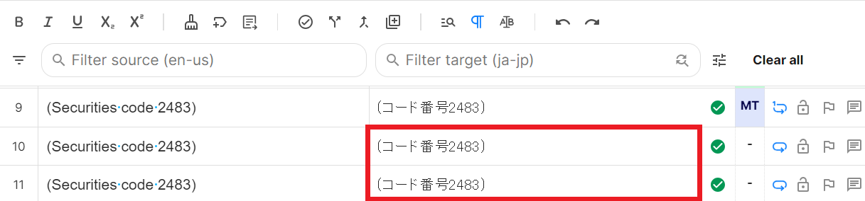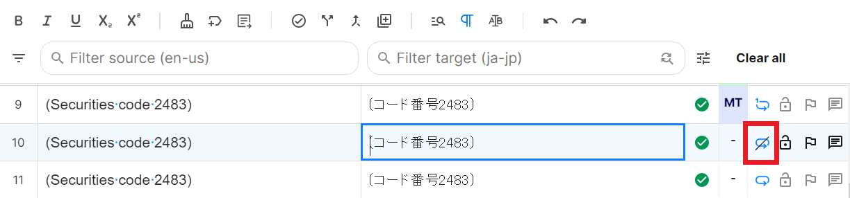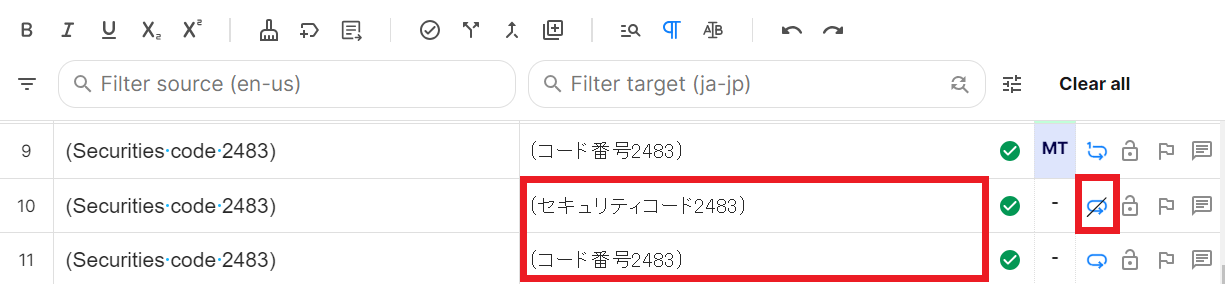 2) 表示されている訳文を確認し、意図的に訳し分けたセグメントがあれば青色の記号をクリックして赤斜線が入った状態にします。
