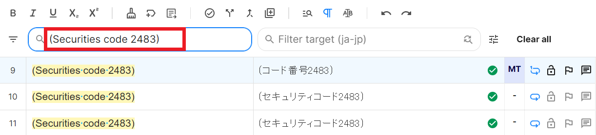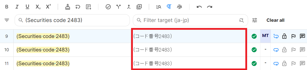 今回は繰り返しのすべてのセグメントの訳が「(証券コード2483)」になるよう操作してください。