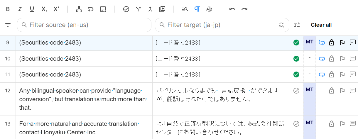 セグメント10はセグメント9と原文が同じため、訳文が自動反映されています。