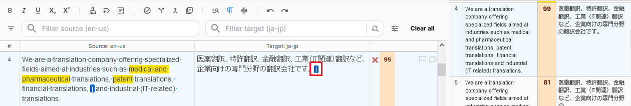 3) セグメントを結合した結果、一致率の高いTM訳がCAT欄に表示された場合は適宜訳文を編集します。今回は99%一致のTM(橙色99、数字は一致率)があるので流用してから修正することにします。TMを流用すると訳文欄にあった[j]タグが削除されますので、ご注意ください。